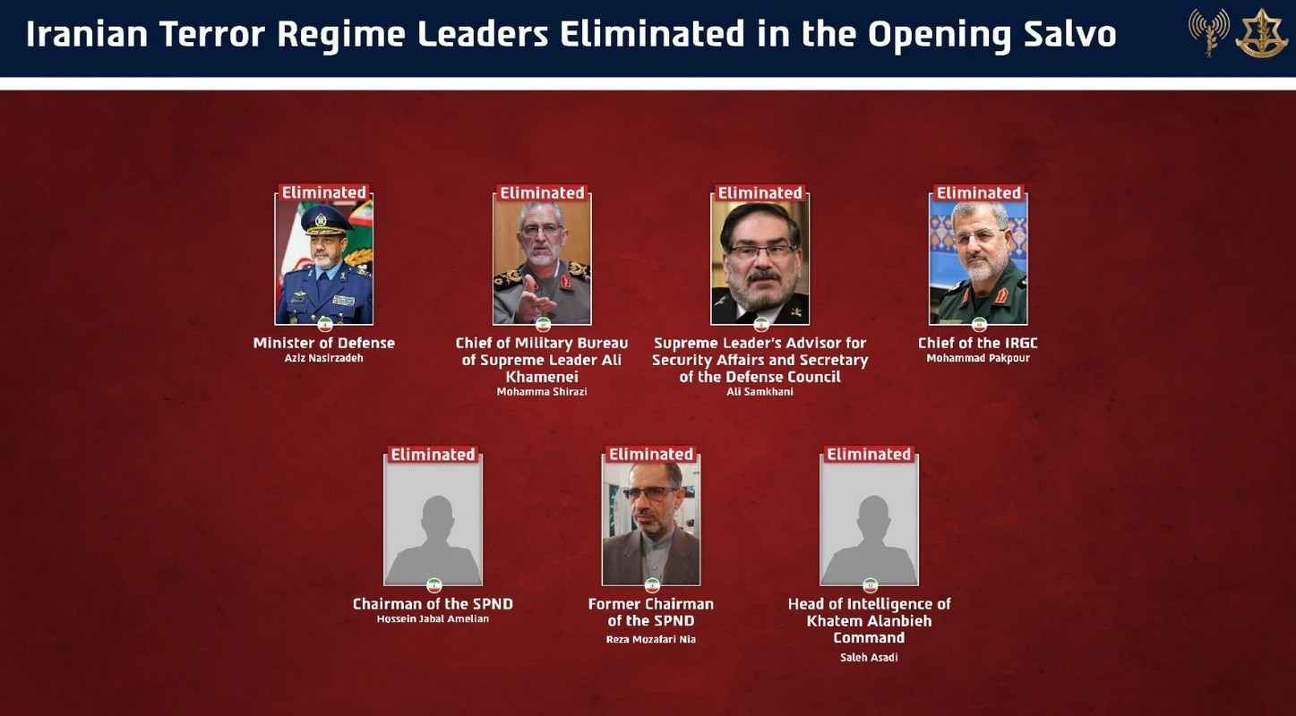 Από την πλευρά του, εκπρόσωπος του ισραηλινού στρατού δήλωσε ότι οι ακόλουθοι ανώτεροι Ιρανοί αξιωματούχοι περιλαμβάνονται μεταξύ όσων σκοτώθηκαν: