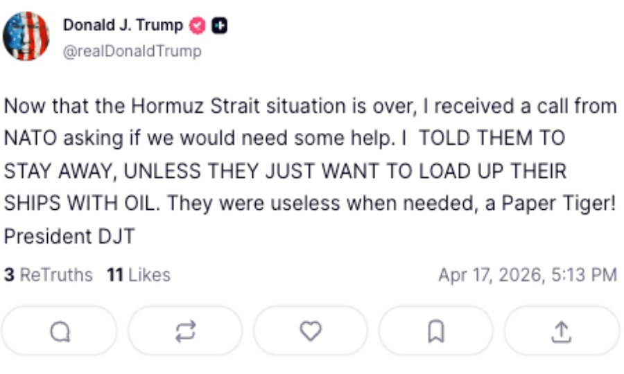 «Τώρα που η κατάσταση στα Στενά του Ορμούζ έχει ηρεμήσει, έλαβα ένα τηλεφώνημα από το ΝΑΤΟ που με ρωτούσε αν χρειαζόμαστε βοήθεια. ΤΟΥΣ ΕΙΠΑ ΝΑ ΜΕΙΝΟΥΝ ΜΑΚΡΙΑ, ΕΚΤΟΣ ΑΝ ΘΕΛΟΥΝ ΑΠΛΩΣ ΝΑ ΓΕΜΙΣΟΥΝ ΤΑ ΠΛΟΙΑ ΤΟΥΣ ΜΕ ΠΕΤΡΕΛΑΙΟ. Ηταν άχρηστοι όταν τους χρειαζόμασταν, χάρτινη τίγρη!», έγραψε σε νέα ανάρτηση ο Αμερικανός πρόεδρος.