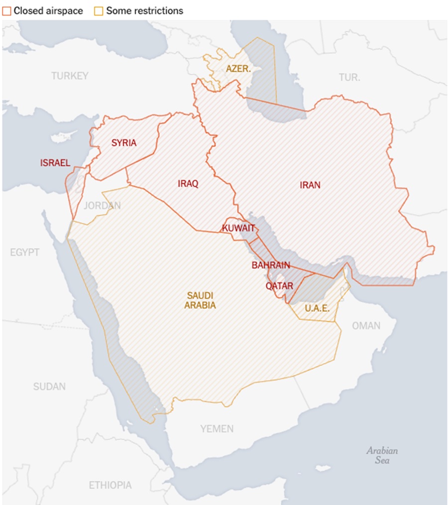 Οπως αποτυπώνεται στον χάρτη σχεδόν όλη η Μέση Ανατολή είτε έχει αποκλειστεί αεροπορικώς είτε έχει περιορισμούς.