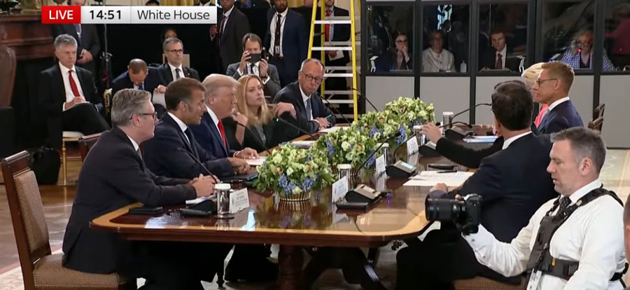 Στο Οβάλ Γραφείο, όπου είχε σημειωθεί το προηγούμενο επεισόδιο, κάθονταν ξανά ο αντιπρόεδρος Βανς και ο υπουργός Εξωτερικών Ρούμπιο. Τον Φεβρουάριο, ο Βανς είχε επικρίνει ανοιχτά τον Ουκρανό πρόεδρο· αυτή τη φορά έμεινε σιωπηλός, αφήνοντας μόνο τους δύο ηγέτες να μιλήσουν.