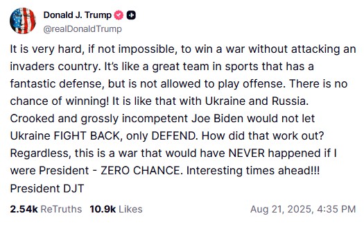 «Είναι πολύ δύσκολο, αν όχι αδύνατο, να κερδίσεις έναν πόλεμο χωρίς να επιτεθείς στη χώρα του εισβολέα», έγραψε ο Τραμπ, συγκρίνοντας την κατάσταση με μια ομάδα που έχει ισχυρή άμυνα αλλά δεν της επιτρέπεται να παίξει επίθεση. «Δεν υπάρχει καμία πιθανότητα νίκης», πρόσθεσε.