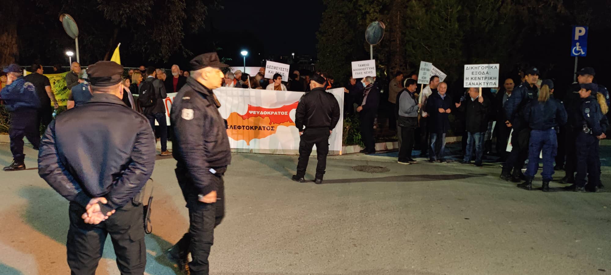 Διαμαρτυρία έξω από το «Omega», λίγο πριν την έναρξη του δεύτερου διακαναλικού debate, πραγματοποιούν μέλη των συνδέσμων κουρεμένων καταθετών και κατόχων αξιογράφων.
