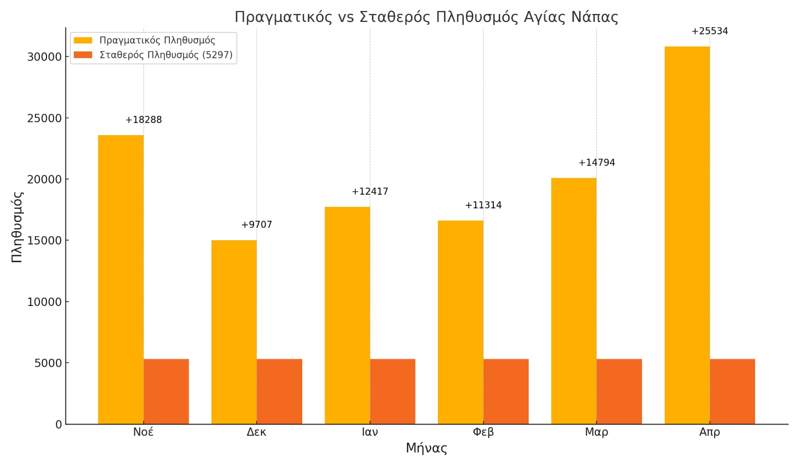 Με αφορμή την περίπτωση της Αγίας Νάπας, έχει διενεργηθεί ανάλυση βάσει των ροών λυμάτων στο αποχετευτικό σύστημα της περιοχής, χρησιμοποιώντας εξειδικευμένη φόρμουλα για τον υπολογισμό του ισοδύναμου πληθυσμού. Τα ευρήματα είναι ενδεικτικά: ο πραγματικός πληθυσμός, ο οποίος αποτελείται σε μεγάλο ποσοστό από τουρίστες, είναι πολλαπλάσιος του αριθμού που προκύπτει από την απογραφή.