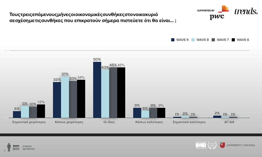 Σταθεροποίηση του οικονομικού κλίματος προβλέπουν τα νοικοκυριά σε σχέση με την επόμενη τριμηνία. Αν πρέπει να διαλέξουμε πλευρά η επόμενη προτίμηση είναι στην μικρή χειροτέρευση της κατάστασης την οποία προβλέπει το 32% των ερωτηθέντων. Με βάση τις απαντήσεις την μεγαλύτερη ανασφάλεια φαίνεται να βιώνουν οι συνταξιούχοι αφού σε ποσοστό 38% αναμένουν χειροτέρευση των οικονομικών τους συνθηκών. Σε γενικές γραμμές οι απαντήσεις στο συγκεκριμένο ερώτημα αν συγκριθούν με προηγούμενες μετρήσεις παραπέμπουν σε μεγαλύτερη αισιοδοξία των ερωτηθέντων αφού στις απολύτως αρνητικές απαντήσεις υπάρχει μείωση 50% ενώ όσοι βλέπουν σταθεροποίηση αυξήθηκαν κατά 15%.