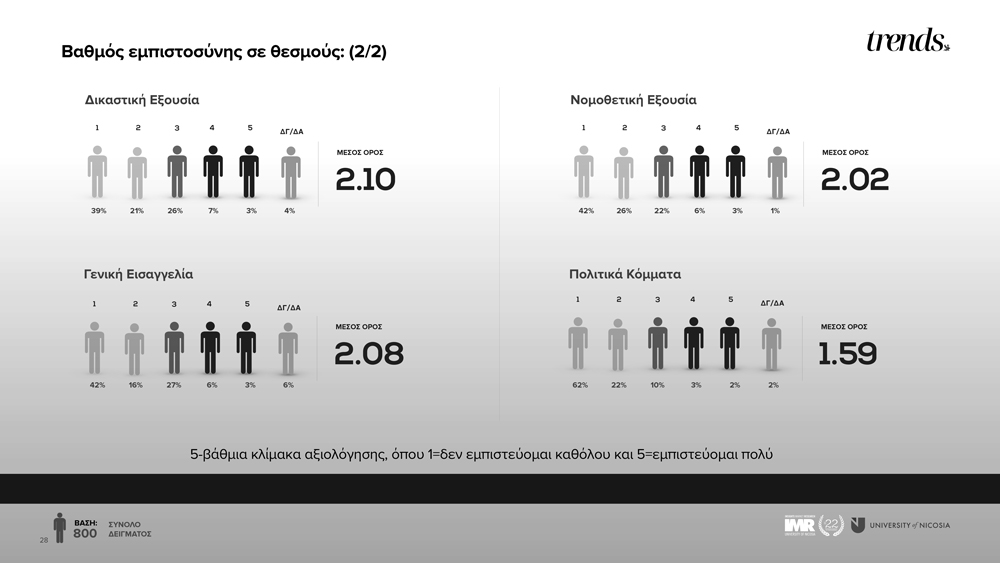Οι πολίτες φαίνεται ότι δεν εμπιστεύονται ούτε τη δικαστική εξουσία η οποία έχει την αρμοδιότητα να απονέμει δικαιοσύνη, να ερμηνεύει τους νόμους και να επιλύει διαφορές μεταξύ πολιτών, ή μεταξύ πολιτών και κράτους ενεργώντας ανεξάρτητα από τις άλλες, την κυβέρνηση και τη Βουλή, ώστε να εγγυάται την αντικειμενικότητα, αμεροληψία και την προστασία των δικαιωμάτων των πολιτών. Όπως φαίνεται από τα ευρήματα της έρευνας του 9ου κύματος «Ktrends», οι πολίτες αξιολογούν τον βαθμό εμπιστοσύνης τους προς τη δικαστική εξουσία με 2,10 κατά μέσο όρο, από τα 5. Ιδιαίτερα σημαντικό κρίνεται το γεγονός ότι οι συμμετασχόντες στην έρευνα της εφημερίδας «Η Καθημερινή», που έχει διενεργήσει η εταιρεία IMR σε συνεργασία με το Πανεπιστήμιο Λευκωσίας την περίοδο Ιανουαρίου - Φεβρουαρίου 2025, δεν εμπιστεύονται την κυβέρνηση. Συγκεκριμένα, τα αποτελέσματα της έρευνας επισημαίνουν ότι οι πολίτες εμπιστεύονται την κυβέρνηση κατά 2,12 μέσο όρο από μια 5βάθμια κλίμακα αξιολόγησης. Ενδεικτικό είναι το γεγονός ότι οι πολίτες εμπιστεύονται σε μεγαλύτερο βαθμό τα Μέσα Μαζικής Ενημέρωσης από ό,τι εμπιστεύονται την κυβέρνηση καθώς ο βαθμός εμπιστοσύνης στα ΜΜΕ ανέρχεται στο 2,22 κατά μέσο όρο. Στην αμέσως επόμενη θέση βρίσκουμε την Ελεγκτική Υπηρεσία, σύμφωνα με τα ευρήματα της έρευνας. Ο κόσμος που συμμετείχε στην έρευνα απάντησε ότι εμπιστεύεται τον θεσμό της Ελεγκτικής Υπηρεσίας κατά 2,39 κατά μέσο όρο με άριστα το 5. Η αστυνομία κρίνεται από τους πολίτες ως ο πιο αξιόπιστος θεσμός, σύμφωνα με τα ευρήματα της έρευνας. Ο θεσμός της αστυνομίας συγκεντρώνει 2,53 βαθμούς κατά μέσο όρο στα μάτια των πολιτών.