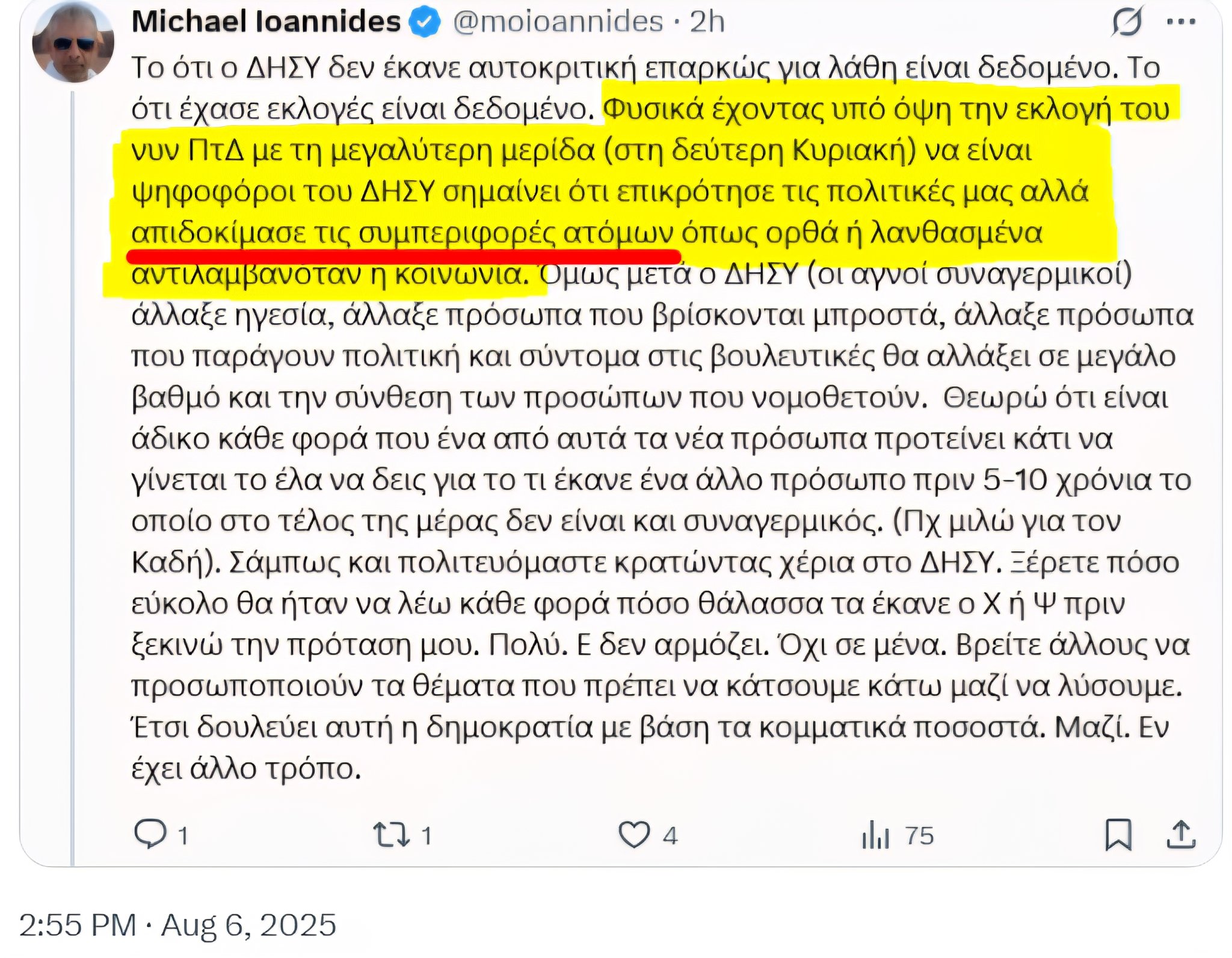 Σε ανάρτησή του στην πλατφόρμα «X» ο κ. Ιωαννίδης ανέφερε ότι «είναι πραγματικότητα ότι δεν έγινε ποτέ συνέδριο για να κριθούν οι αλήθειες, να αξιολογηθούν τα πραγματικά γεγονότα και να αποδοθούν οι ευθύνες εκεί που πρέπει. Αυτή είναι μια πραγματικότητα», επισημαίνοντας πως «από εκεί και πέρα, όμως, δεν μπορεί να χρησιμοποιείτε κάθε μέσο για να δικαιολογήσετε ένα πλέγμα αποφάσεων και πράξεων που έγιναν σε κλειστά δωμάτια, πίσω από την πλάτη των αγνών οπαδών της παράταξής μας».