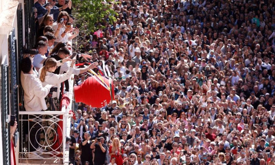 Τα λευκά γάντια των χορευτών πλαισιώνουν τη φιγούρα της Rosalia, ενώ εκείνη αλλάζει «μορφές» στην περφόρμανς του τραγουδιού «La Perla», που σκηνοθέτησε ο Δημήτρης Παπαϊωάννου.