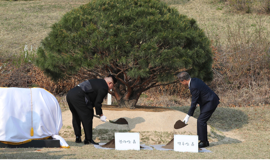 Ο Βορειοκορεάτης ηγέτης και ο Νοτιοκορεάτης πρόεδρος έριξαν με φτυάρια χώμα στις ρίζες του δέντρου και αποκάλυψαν ένα πέτρινο μνημείο, στο οποίο ήταν χαραγμένη η φράση: «Φυτεύοντας το δέντρο της ειρήνης και της ευημερίας» πάνω από τα ονόματα των δύο ηγετών και τους επίσημους τίτλους τους.