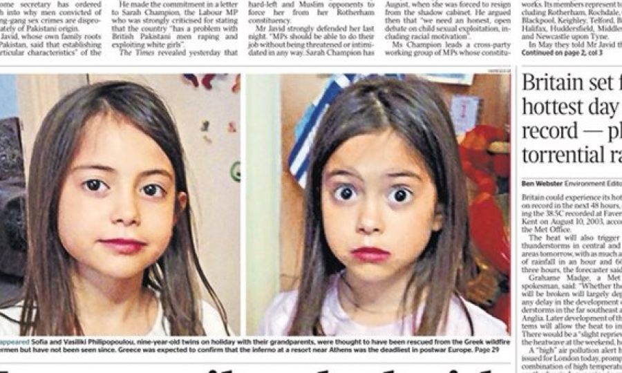 Η έκδοση της βρετανικής εφημερίδας Times κυκλοφορεί με κεντρικό θέμα στο πρωτοσέλιδο της τα δύο 9χρονα κορίτσια. Όπως σημειώνεται, οι δίδυμες αδερφές παραθέριζαν με τους παππούδες τους σε τουριστικό θέρετρο έξω από την Αττική το οποίο επλήγη από την πυρκαγιά και περισυλέγησαν από ψαράδες της περιοχής, όμως έκτοτε αγνοούνται.