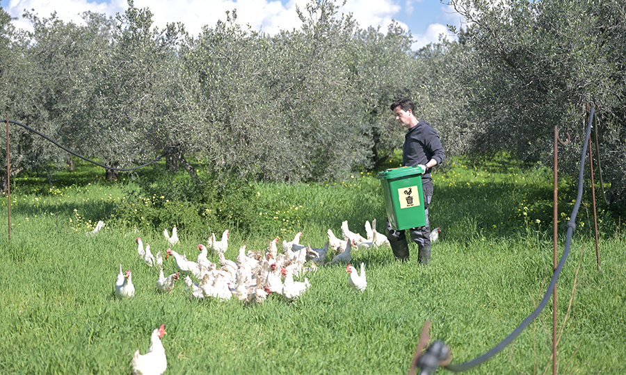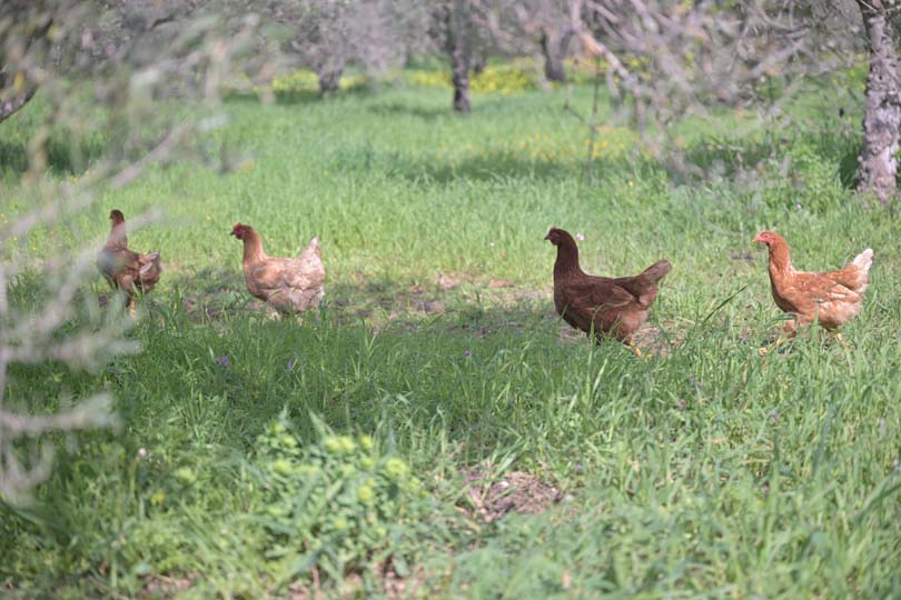 «Επειδή θέλω να σχεδιάσω ένα παραγωγικό οικοσύστημα, χρειάζεται να υπάρχουν ζώα για να επισπευσθεί ο κύκλος του άνθρακα» εξηγεί ο Νικολά. «Πρέπει οι πρασινάδες του εδάφους να γίνονται τροφή για ζώα και να μετατρέπονται σε λίπασμα. Τα λιπάσματα που χρησιμοποιούμε τώρα είναι βασικά κοπριά κότας που εισάγουμε από την Ιταλία. Τι χρειαζόμαστε συνεπώς; Κότες. Την ίδια ώρα, επειδή η Έλενα είναι χορτοφάγος και δεν θέλει να σκοτώνει ζώα, δεν επιθυμούμε να παράγουμε προϊόντα ζωικής προέλευσης. Όταν γίνουν δύο ετών, οι κότες σταματούν να κλωσούν αβγά ή κάνουν αβγά που είναι πολύ μικρά και συνήθως οδηγούνται στο σφαγείο, όπου γίνονται τροφή για σκύλους. Επινοήσαμε συνεπώς την ιδέα να φέρνουμε κότες στη δύση της… καριέρας τους. Η ιδέα ήταν να φέρνουμε τέτοιες κότες, να συνταξιοδοτούνται στη δική μας φάρμα, να τρώνε τις πρασινάδες στο χώμα, να γονιμοποιούν τα δέντρα και να ελέγχουν τα παράσιτα, όπως αυτά που πέφτουν από τις ελιές και οι κότες τα ανακατεύουν και τα τρώνε. Με αυτόν τον τρόπο γλιτώνουμε κι από τα έξοδα λιπάσματος».