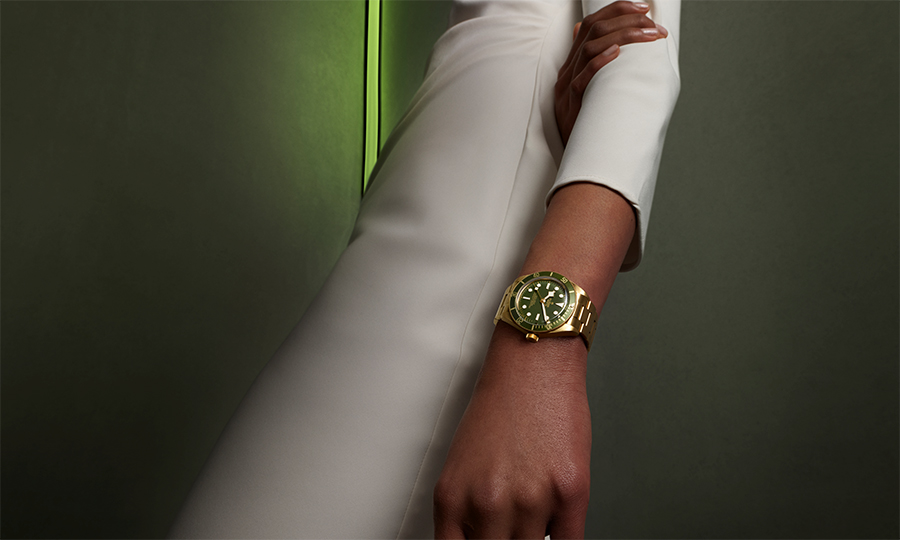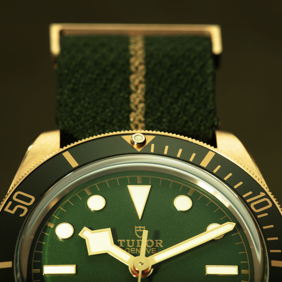 Η αποθήκη της μπουτίκ, είχε να μου χαρίσει ένα ακόμη μυστικό. Αυτό, ακόμη πιο ιδιαίτερο και αποκλειστικό. Ένα Black Bay το οποίο πειραματίζεται με ατόφια χρυσή κάσα και μπρασελέ, 18 καρατιών. Ο μηχανισμός ΜΤ5400 μένει σταθερός, μα αυτή τη φορά είναι σε κοινή θέα με το exhibition case-back. Το χρώμα, ένα έντονο κίτρινο χρυσό με αβρούς υποτόνους πράσινου, δένει αρμονικά στο βαθύ σκουροπράσινο καντράν. Για ένα χρυσό ρολόι, συμπεριφέρεται απροσδόκητα σαν ένα κλασσικό Tudor. Αποφεύγει την λάμψη και έντονη παρουσία, με το σατινέ φινίρισμα του σε όλες τις επιφάνειες να απορροφάει το φως, παρά να το αντανακλά. Δεν θα το έλεγε κανείς φτηνό κομμάτι, αφού με τα ίδια λεφτά μπορείς να αγοράσεις ένα Daytona· ή ένα Datejust 41 και ένα Submariner μαζί· ή και προκαταβολή για εκείνο το οικόπεδο στο Πρωταρά. Το βαρύ της τιμής του, μεταφράζεται και στον καρπό, αφού η πυκνότητα του χρυσού θα σου εξασφαλίσει μια αίσθηση στιβαρότητας και πολυτέλειας που δεν περνά απαρατήρητη.