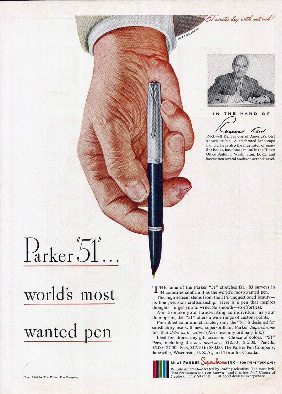 Το Chianti Classico της καλλιγραφικής μηχανουργίας - την Parker 51. Η εταιρία που έβαλε την τελεία στον Β’ παγκόσμιο πόλεμο, η Πάρκερ, παρουσιάζει μια πένα με blazer. Διατίθεται με nib ή ball point, αφήνοντας την επιλογή μεταξύ πρακτικότητας και χαρακτήρα κυριολεκτικά στο χέρι σου. Δεν εντυπωσιάζει με υπερβολές, αλλά κερδίζει τον σεβασμό με βρετανική εγκράτεια, αεροδυναμική φόρμα και καπάκι που κουμπώνει με ένα ήχο που αξίζει να συνοδεύει κάθε μεγάλη απόφαση, και μιλάει μόνο όταν έχει κάτι σημαντικό να πει.