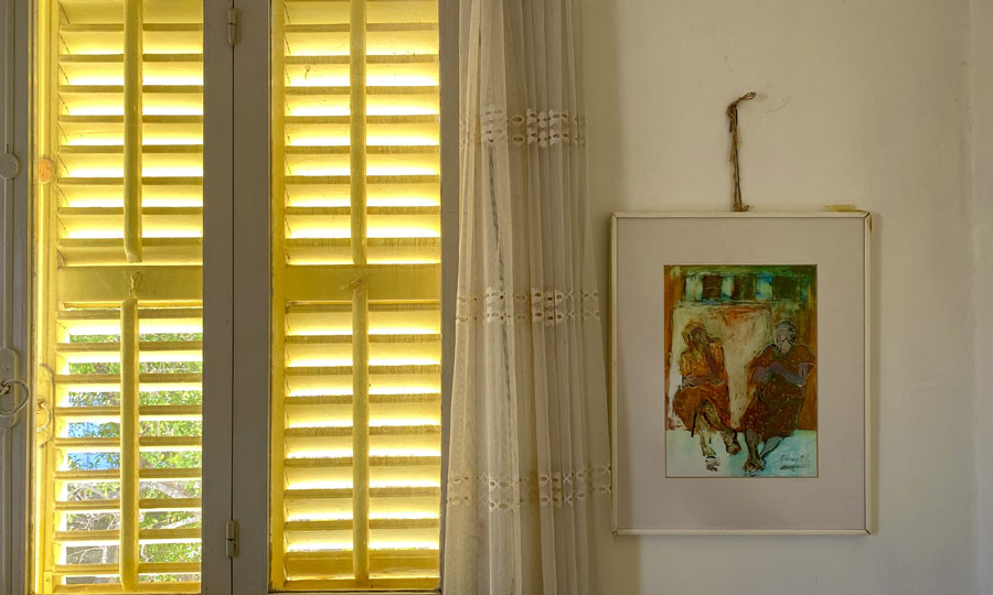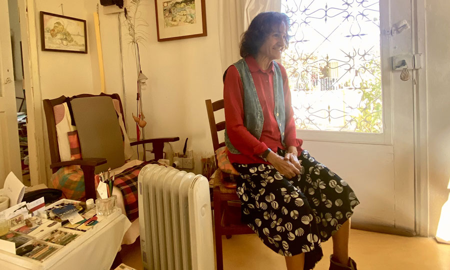 Το σπίτι της μικρό, φτωχικό, “δεν είναι δικό μου, είναι της Μαρίας, ήρθε και το είδε, είχε θυμό, τί φταίω όμως εγώ;”, το δικό της είναι στη Λουρουτζίνα, το ζωγραφίζει σε όλα της τα σχέδια όπως και τα άλλα σπίτια του χωριού της και τους δρόμους και τα δέντρα και τα γαιδούρια και τους ανθρώπους και τα αστέρια. “Έλα να σου το δείξω” μου είπε, χάζευα την ξώπορτα που την έβαψε κίτρινη, την ακολούθησα σε ένα μικρό διάδρομο, καθοδόν συνειδητοποίησα πως υπήρχαν παντού μικρές κίτρινες γωνιές- στην κουζίνα, στο μπάνιο, στο καθιστικό- σαν ήλιοι δωματίου, και αναμεταξύ τους διάφανα ποτήρια με λουλούδια, γεράνια κόκκινα ή φούξια που ταιριάζουν στο κίτρινο.