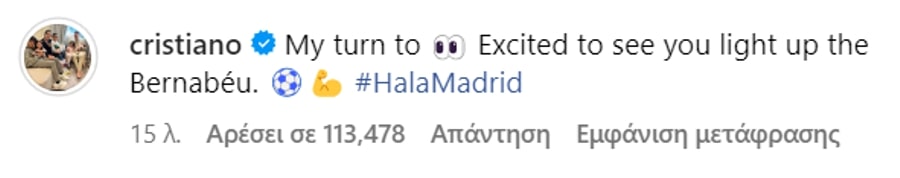 «Σειρά μου να παρακολουθώ. Ανυπομονώ να σε δω να φωτίζεις το Μπερναμπέου», έγραψε συγκεκριμένα ο «CR7» κάτω από το ποστάρισμα του Εμπαπέ, παραδίδοντας με άτυπο τρόπο τη «σκυτάλη» στον 25χρονο επιθετικό.