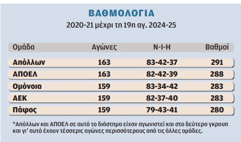 Λαμβάνοντας υπόψη τις βαθμολογίες των τελευταίων τεσσάρων χρόνων συν τους βαθμούς της φετινής χρονιάς μέχρι και τη 19η αγωνιστική, θα διαπιστώσουμε ότι τον πρώτο από τον πέμπτο τους χωρίζουν μόλις έντεκα βαθμοί. Και όσοι διερωτώνται ποια ομάδα έχει τους περισσότερους βαθμούς σε αυτά τα τεσσεράμισι χρόνια είναι ο… Απόλλωνας. Ναι, η ομάδα στην οποία έχει ασκηθεί ίσως η περισσότερη πίεση για να προχωρήσει σε ριζικές αλλαγές. Προφανώς τα τελευταία χρόνια δεν διεκδικεί τον τίτλο, αλλά οι βάσεις και η δυναμική υπάρχουν.