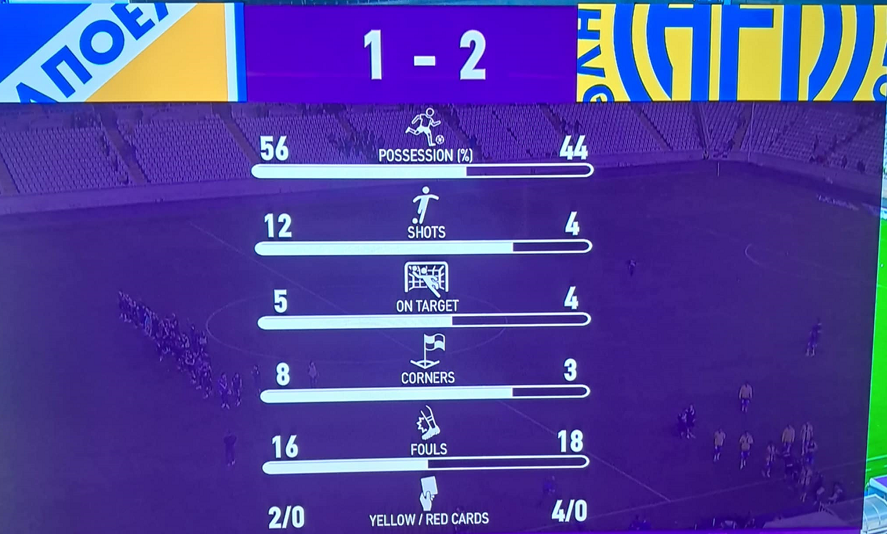 Τελευταία αξιόλογη στιγμή στο πρώτο μέρος η κεφαλιά του Λαίφη στο 43’, μετά από εκτέλεση φάουλ, με τον πολύπειρο κίπερ να αποκρούει.