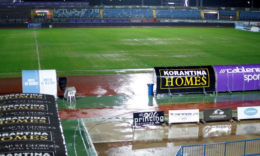 Άναψε κόκκινο στη σέντρα του Πάφος-ΑΠΟΕΛ η βροχή. Ο αγώνας αναβλήθηκε λόγω της κακής και επικίνδυνης κατάστασης του αγωνιστικού χώρου του «Στέλιος Κυριακίδης», απόρροια των έντονων βροχοπτώσεων που έπεσαν στην επαρχία Πάφου τις τελευταίες ώρες.