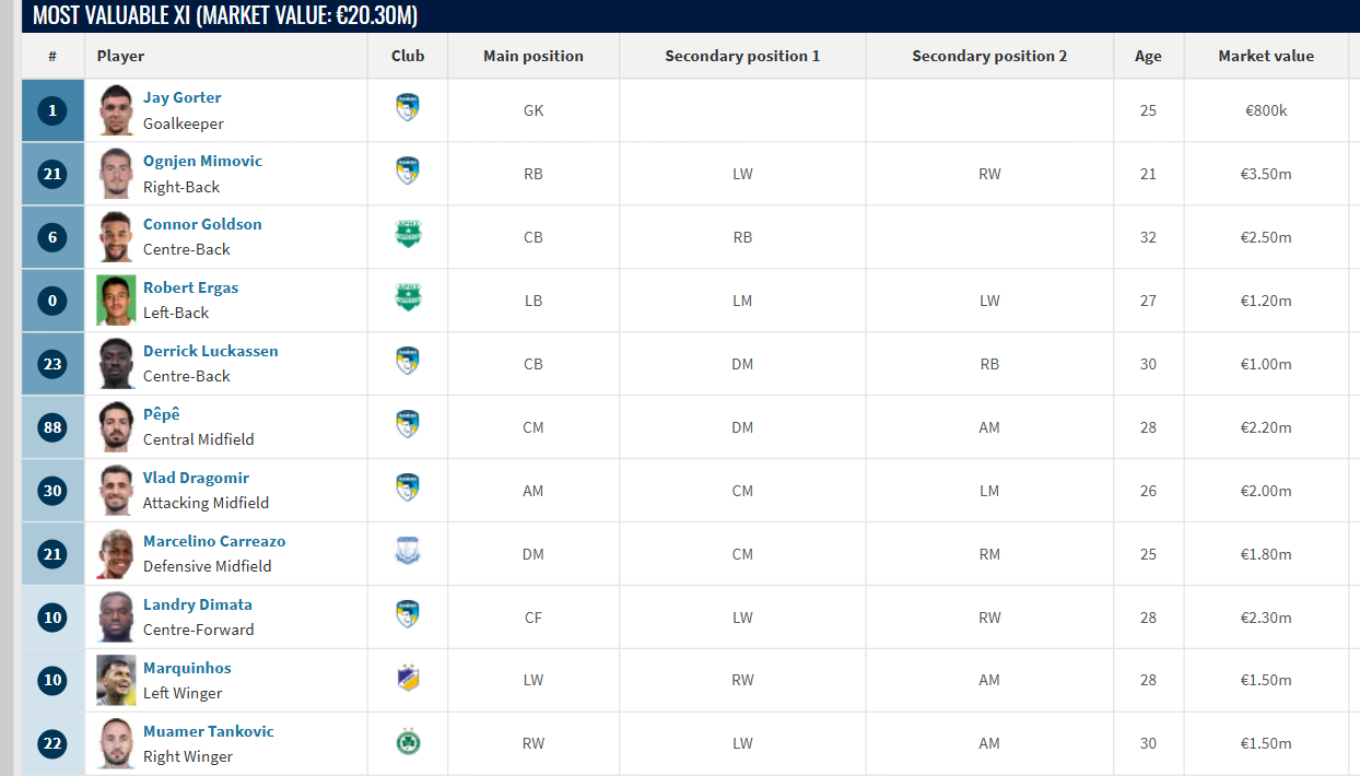 Με το σύστημα 4-2-3-1 το Τransfermarkt παρουσιάζει την κορυφαία ενδεκάδα του κυπριακού πρωταθλήματος από πλευράς market value: