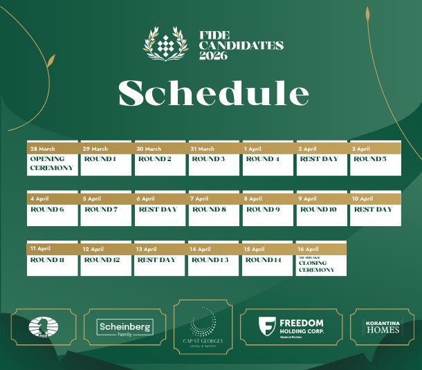 Από τις 28 Μαρτίου έως τις 16 Απριλίου, το νησί μετατρέπεται στο επίκεντρο της παγκόσμιας σκακιστικής σκηνής, με τα βλέμματα όλου του κόσμου στραμμένα πάνω του. Η αυλαία ανοίγει επίσημα το Σάββατο 28 Μαρτίου στις 19:00, σε μια λαμπρή τελετή έναρξης.
