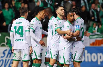 Μετά από το τέρμα με το οποίο οι γηπεδούχοι πήραν προβάδισμα, οι κιτρινοπράσινοι «πάτησαν» τους αντιπάλους τους, τούς… έκλεισαν στο μισό γήπεδο και με σχεδόν μόνιμη κατοχή της μπάλας (75%) επιδίωξαν την ισοφάριση. Αφότου προειδοποίησαν με σημαντικές ευκαιρίες των Ροσάλες, Γκιούρτσο και Ντάρμπισαϊαρ, η ΑΕΚ με κεφαλιά του Άγγλο στράικερ έπειτα από σέντρα του Γκαρθία, ισοφάρισε στο 35’, ενώ ολοκλήρωσε το ημίχρονο με ανατροπή. Ο Ντάρμπισαϊαρ στο 43’, με την πλάτη στην άμυνα και σουτ εντός περιοχής φρόντισε ώστε η ομάδα του να πάει με προβάδισμα 2-1 στα αποδυτήρια.