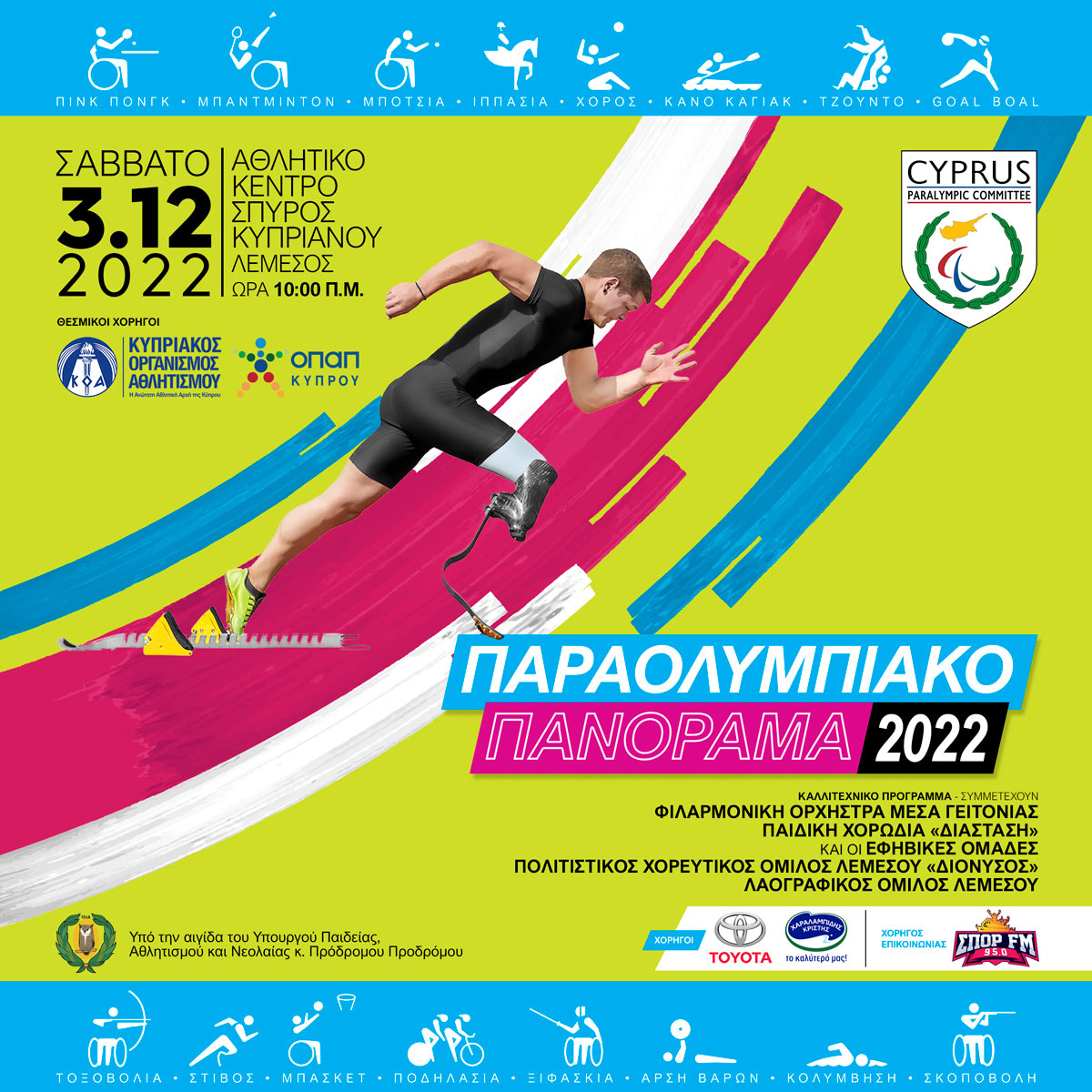 Η Κυπριακή Εθνική Παραολυμπιακή Επιτροπή διοργανώνει για πρώτη φορά, το Σάββατο 3 Δεκεμβρίου στις 10:00 π.μ. εκδήλωση με τίτλο Παραολυμπιακό Πανόραμα στο Αθλητικό Κέντρο Σπύρος Κυπριανού στην Λεμεσό με αφορμή την Παγκόσμια Ημέρα Ατόμων με αναπηρία.