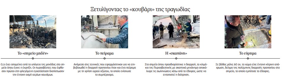 Εκτός των δύο πραγματογνωμόνων, στο σημείο κλήθηκε από τα στελέχη της ΔΑΕΕ και ένας μηχανολόγος – μηχανικός, ο οποίος με τη χρήση ειδικών μηχανημάτων βεβαίωσε την έντονη διαρροή προπανίου από τις δύο υπέργειες δεξαμενές. Με τη χρήση ανιχνευτή χειρός, μάλιστα, ο μηχανικός προσδιόρισε ότι το προπάνιο που διέρρεε από τους χαλύβδινους σωλήνες, μέσω του σαθρού εδάφους και οπών στο τσιμεντένιο δάπεδο, έβρισκε δίοδο στον χώρο του υπογείου. Το προπάνιο και μια σπίθα από αυτόματη αντλία νερού που λειτουργούσε στον χώρο προκάλεσαν την ισχυρή έκρηξη.