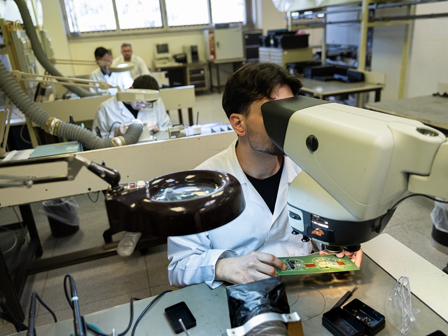 Στο τέλος ενός διαδρόμου, πίσω από μια κόκκινη πόρτα δεκαετίας του ’80, άνδρες με λευκές ποδιές εργάζονται σκυμμένοι πάνω σε τραπέζια εργασίας και πίσω από μεγεθυντικούς φακούς, παλεύοντας με ηλεκτρονικές πλακέτες, τσιπάκια και καλώδια.