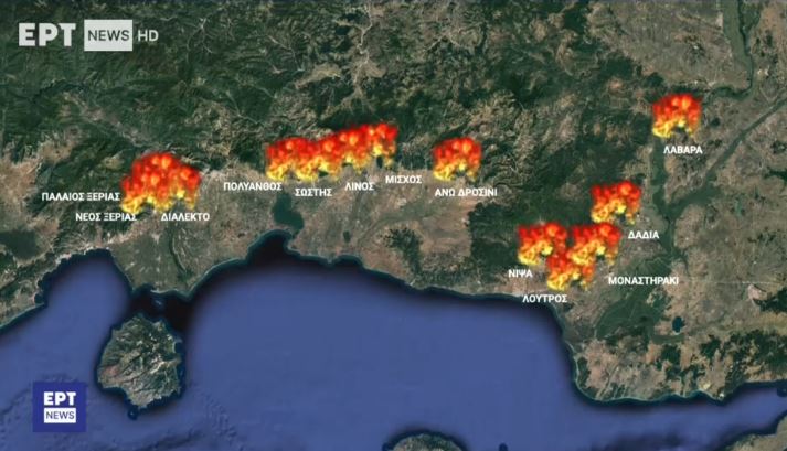 Τα πύρινα μέτωπα όπως αποτυπώνονται στο γράφημα της ΕΡΤ.