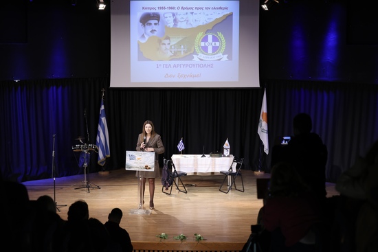 Η κα. Ζαχαράκη, συνοδευόμενη από τον Πρέσβη της Κύπρου, Σταύρο Αυγουστίδη, βρέθηκε, χθές, στο Πολιτιστικό Κέντρο Δήμου Ελληνικού-Αργυρούπολης, στις εκδηλώσεις που οργάνωσε το 1ο ΓΕΛ Αργυρούπολης, για την 71η επέτειο από την έναρξη του Εθνικοαπελευθερωτικού Αγώνα των Κυπρίων Αγωνιστών (1955-1959), που γιορτάζεται από πέρυσι στα σχολεία ολόκληρης της χώρας.