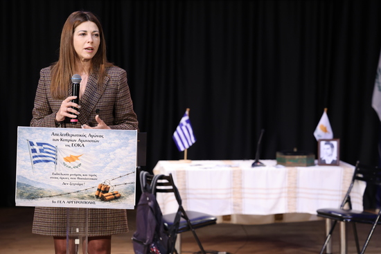 «Τα ονόματα για τα οποία μάθατε σήμερα, Ευαγόρας Παλληκαρίδης, Πέτρος Γιάλλουρος, Μιχαήλ Καραολής και Γρηγόρης Αυξεντίου, δεν είναι απλά ονόματα. Είναι νέοι άνθρωποι ανάμεσά τους και μαθητές, οι οποίοι μπήκαν σε έναν αγώνα, επιλέγοντας ακόμη και να θυσιάσουν τη ζωή τους για την ελευθερία και την ανεξαρτησία», τόνισε, χαρακτηριστικά, η Υπουργός Παιδείας, απευθυνόμενη στους μαθητές και τις μαθήτριες.