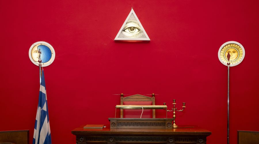 Kathimerini.gr Οπου κι αν στραφεί το βλέμμα υπάρχει κάποιο σύμβολο. Η μεγάλη αίθουσα με την ονομασία «Ελευσίς» περιστοιχίζεται από κίονες ιωνικού ρυθμού που φέρουν πάνω τους τον ζωδιακό κύκλο. Στο ταβάνι έχει αποτυπωθεί με γύψινο διάκοσμο ο έναστρος ουρανός και στο βάθος, σε ένα σημείο που θα μπορούσε να θυμίζει προμετωπίδα θεατρικής σκηνής, υπάρχει η επιγραφή «Ελευθερία Ισότης Αδελφότης».