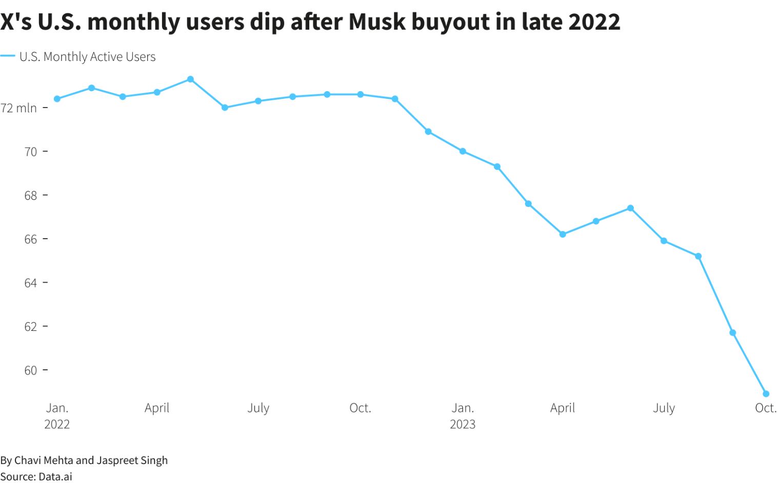 Οι διαφημιστικές δαπάνες στο X στις Ηνωμένες Πολιτείες –από τον Ιανουάριο έως τον Οκτώβριο του τρέχοντος έτους– μειώθηκαν κατά 64%, σε σύγκριση με την ίδια περίοδο το 2022, σύμφωνα με στοιχεία της εταιρείας Guideline, η οποία παρακολουθεί τα δεδομένα διαφημιστικών δαπανών από μεγάλες διαφημιστικές εταιρείες.