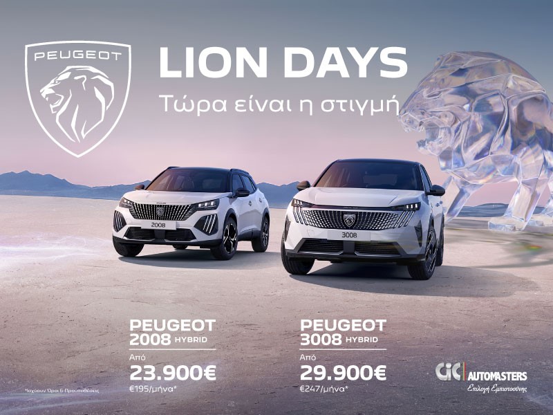 Η Peugeot παρουσιάζει στην κυπριακή αγορά την προωθητική ενέργεια «Lion Days», μια καμπάνια που φέρνει τα δύο δημοφιλή SUV της μάρκας σε ιδιαίτερα ελκυστικές τιμές. Αφορά τα υβριδικά Peugeot 2008 και 3008, δίνοντας την ευκαιρία στο κοινό να αποκτήσει ένα σύγχρονο, τεχνολογικά προηγμένο μοντέλο. Πιο συγκεκριμένα, το Peugeot 2008 Hybrid προσφέρεται στο πλαίσιο της καμπάνιας από €23.900 ή με €195 το μήνα, ενώ το μεγαλύτερο και πιο premium Peugeot 3008 Hybrid διατίθεται από €29.900 ή με €247 το μήνα. Και τα δύο μοντέλα είναι άμεσα διαθέσιμα, επιτρέποντας στους ενδιαφερόμενους να αποκτήσουν το νέο τους αυτοκίνητο χωρίς αναμονές.