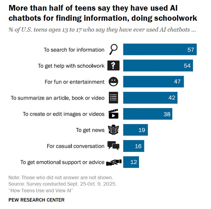 Σύμφωνα με έρευνα του Pew Research Center (25 Σεπτεμβρίου – 9 Οκτωβρίου 2025), το 57% έχει χρησιμοποιήσει chatbots για αναζήτηση πληροφοριών και το 54% για βοήθεια σε σχολικές εργασίες. Το 47% τα χρησιμοποιεί για διασκέδαση.
