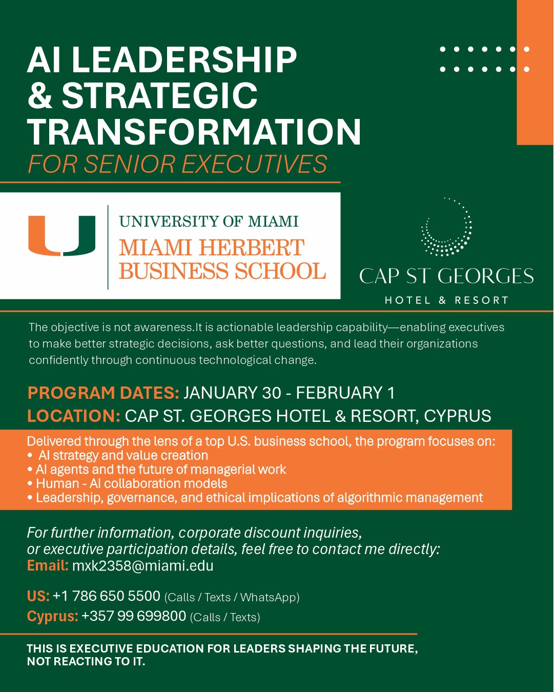 Η Κύπρος και η Πάφος φιλοξενούν ένα υψηλού επιπέδου διεθνές εκπαιδευτικό πρόγραμμα, για ανώτατα στελέχη επιχειρήσεων, με θέμα AI Leadership & Strategic Transformation for Senior Executives, που θα πραγματοποιηθεί στο Cap St Georges Hotel & Resort από τις 30 Ιανουαρίου έως την 1η Φεβρουαρίου 2026.