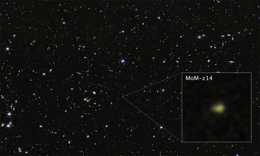 Χρησιμοποιώντας το όργανο NIRSpec (Φασματογράφος Εγγύς Υπέρυθρου) του James Webb, οι αστρονόμοι επιβεβαίωσαν ότι το φως του γαλαξία MoM-z14 ταξιδεύει μέσα στον διαστελλόμενο χώρο, επιμηκυνόμενο και «μετατοπιζόμενο» προς μεγαλύτερα, πιο ερυθρά μήκη κύματος, για περίπου 13,5 από τα εκτιμώμενα 13,8 δισεκατομμύρια χρόνια ύπαρξης του Σύμπαντος.