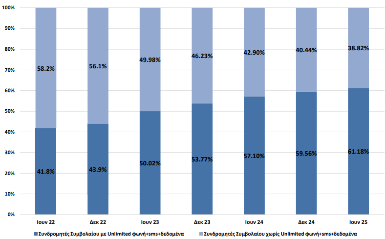 Το ποσοστό συνδρομών συμβολαίου συνεχίζει να παρουσιάζει αύξηση στην Κύπρο, σύμφωνα με τα όσα δημοσιεύει το Γραφείο του Επιτρόπου Ρύθμισης Ηλεκτρονικών Επικοινωνιών και Ταχυδρομείων (ΓΕΡΗΕΤ). για το πρώτο εξάμηνο του 2025. Πιο συγκεκριμένα τα συμβόλαια που προσφέρουν απεριόριστα δεδομένα, χρόνο ομιλία και γραπτά μηνύματα αποτελούν το 61,18% των συνολικών συμβολαίων.