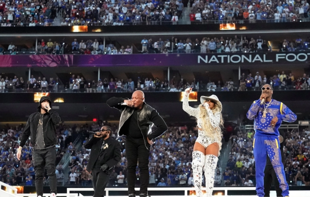 Στιγμιότυπο από το ημίχρονο του φετινού Super Bowl. Από αριστερά προς τα δεξιά: Eminem, Κέντρικ Λαμάρ, Dr. Dre, Μέρι Τζ. Μπλάιτζ και Snoop Dogg. Φωτ.: AP Photo/Chris O’Meara
