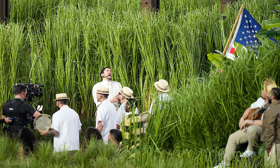 Εκατοντάδες άνθρωποι με κοστούμια από… γρασίδι έδωσαν ζωή στο σκηνικό του Μπενίτο, ενώνοντας τις δυνάμεις τους για να δημιουργήσουν ένα παραδοσιακό πορτορικανικό χωριό με χωράφια ζαχαροκάλαμου, αγρότες, καροτσάκια με φαγητό και μια πολυσύχναστη καζίτα.