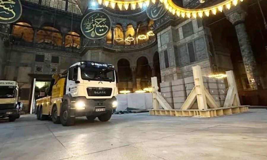 Αντιδράσεις προκάλεσαν στην Τουρκία οι εικόνες βαρέων οχημάτων εντός της Αγίας Σοφίας, που μεταδόθηκαν χθες από τουρκικά ΜΜΕ. Οι φωτογραφίες που δημοσιοποιήθηκαν δείχνουν φορτηγά και γερανούς να κινούνται εντός του μνημείου προκαλώντας ανησυχία για την ακεραιότητά του, καθώς η είσοδος τόσο βαρέως εξοπλισμού από την Πύλη του Αυτοκράτορα ήγειρε φόβους για πιθανές φθορές. Οι τουρκικές αρχές έσπευσαν να επισημάνουν ότι όλες οι διαδικασίες πραγματοποιήθηκαν σύμφωνα με επιστημονικές εκθέσεις, στατιστικές αναλύσεις και αποφάσεις εμπειρογνωμόνων, με απόλυτο σεβασμό στο μοναδικό πολιτιστικό και ιστορικό βάρος του μνημείου, ενώ αργότερα χθες εκδόθηκε αναλυτική ανακοίνωση για το γεγονός από την καθ’ ύλην αρμόδια αρχή, τη Γενική Διεύθυνση Ιδρυμάτων.
