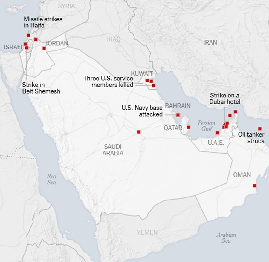 Απειλείται εξάπλωση του πολέμου σε όλη την περιοχή μετά τους βομβαρδισμούς που άρχισαν να εξαπολύουν το Σάββατο οι ΗΠΑ και το Ισραήλ στο Ιράν και τα αντίποινα της Τεχεράνης, θέτοντας σε κίνδυνο τη ναυσιπλοΐα στο στενό του Χουρμούζ, από όπου διέρχεται το 20% του πετρελαίου που καταναλώνεται σε παγκόσμια κλίμακα. Η ναυσιπλοΐα στην Ερυθρά Θάλασσα, που οδηγεί στη Διώρυγα του Σουέζ, ίσως απειληθεί επίσης.