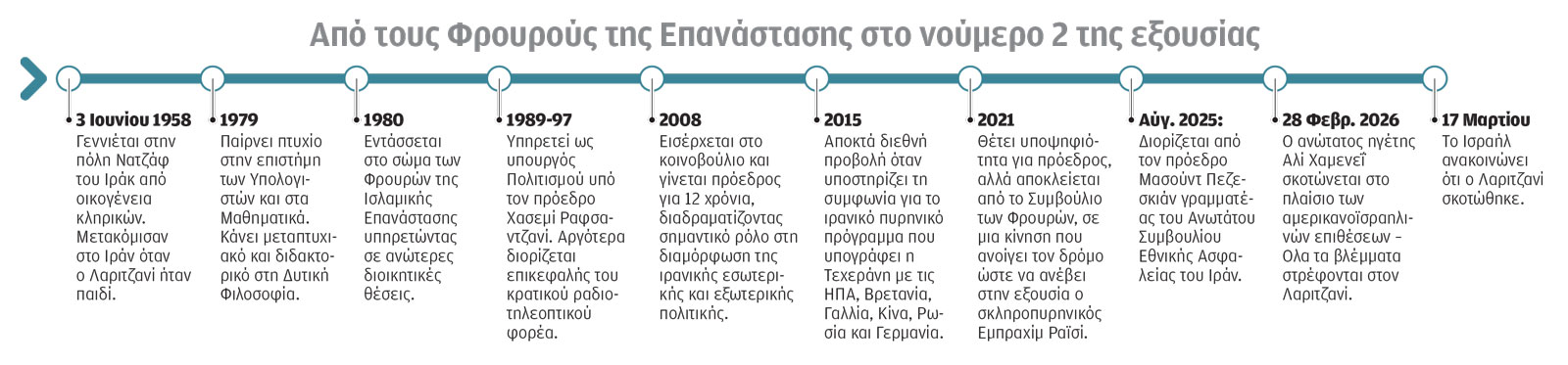 Σοβαρό πλήγμα στην ιρανική ηγεσία, που προσπαθούσε ακόμη να ανασυγκροτηθεί μετά τη δολοφονία του ανωτάτου ηγέτη Αλί Χαμενεΐ στις 28 Φεβρουαρίου, συνιστά η εξόντωση του Αλί Λαριτζανί, γραμματέα του Ανωτάτου Συμβουλίου Εθνικής Ασφαλείας, από τον ισραηλινό στρατό.