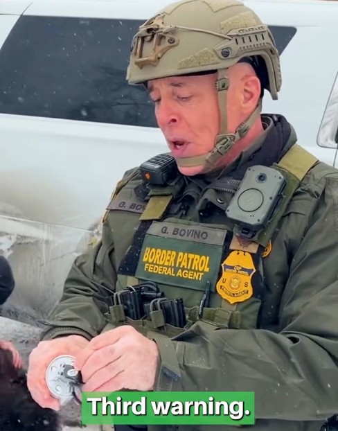 Ο Μποβίνο, κι ενώ δυνάμεις της ICE έχουν ρίξει στο έδαφος διαδηλωτές, ακούγεται να απευθύνει προειδοποίηση και κατόπιν να φωνάζει: «Gas, gas, gas».