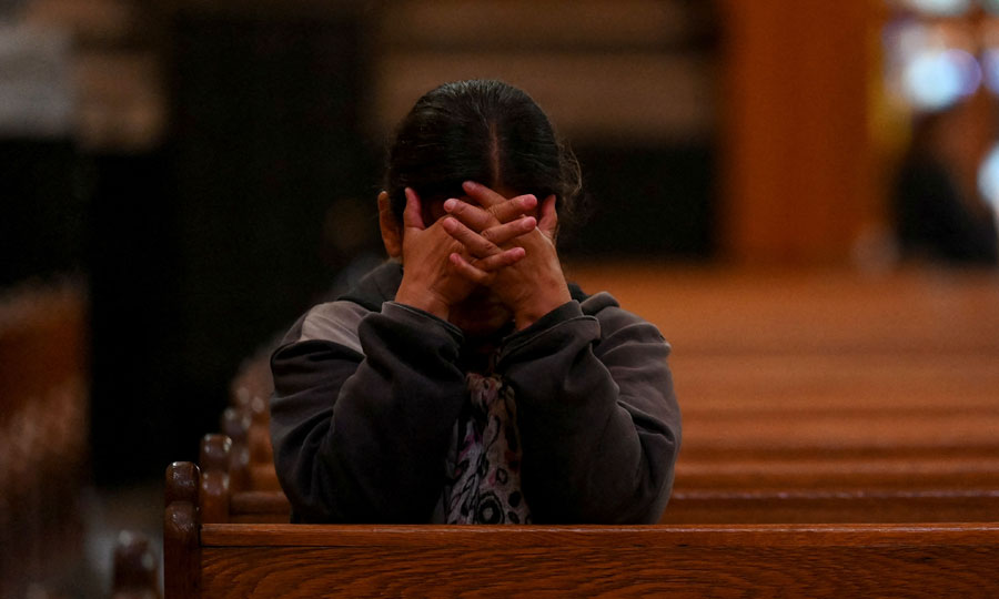 Πιστή προσεύχεται μέσα στη Βασιλική του Σαν Χοσέ ντε Φλόρες, μετά την ανακοίνωση του θανάτου του Πάπα Φραγκίσκου από το Βατικανό. (©REUTERS/Martin Cossarini)