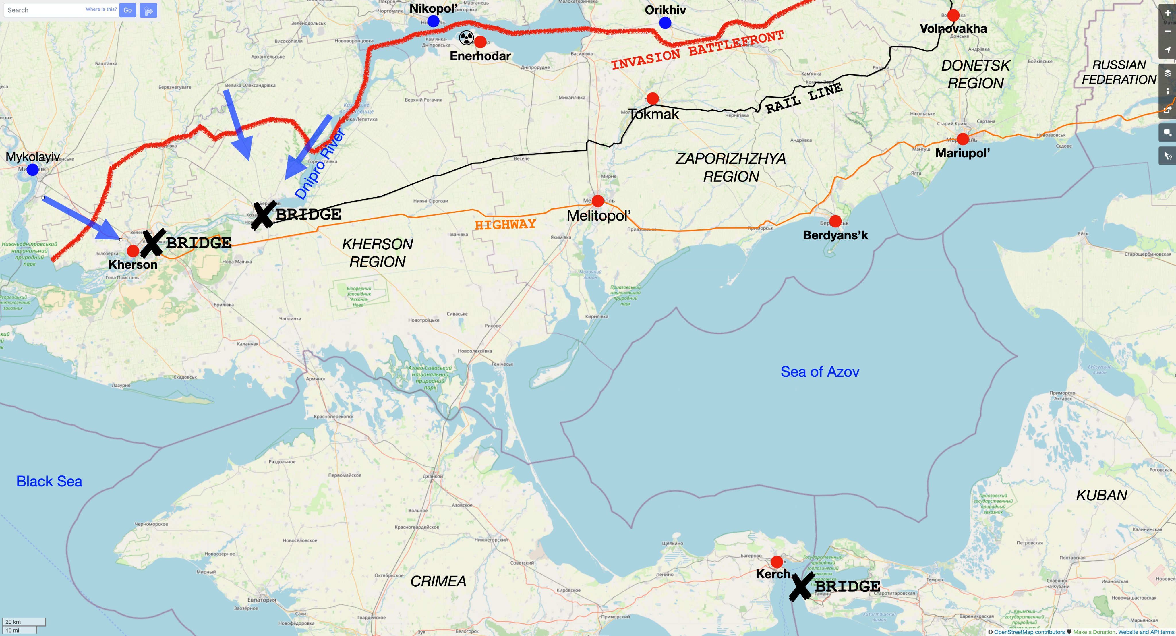 Η Ουκρανία εστιάζει όχι στην περικύκλωση της Χερσώνας αλλά στην πίεση στο βόρειο μέρος (ανατολικά) των σημαντικών περασμάτων του ποταμού Δνειπέρου. Η καταστροφή (μαύρα βέλη στο χάρτη) σημαντικών γεφυρών επί του Δνειπέρου αλλά και στο στενό του Κερτς, επιβραδύνουν σημαντικά την ενίσχυση του ρωσικού μετώπου στην ευρύτερη περιοχή Χερσώνας-Ζαπορίζιε.