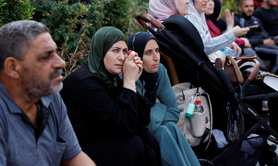 Oικογένειες περιμένουν τους συγγενείς τους στη Ραμάλα, στην κατεχόμενη από το Ισραήλ Δυτική Oχθη, καθώς Παλαιστίνιοι κρατούμενοι απελευθερώνονται από ισραηλινή φυλακή στο πλαίσιο ανταλλαγής με ομήρους και συμφωνίας κατάπαυσης του πυρός στη Γάζα (REUTERS/Ammar Awad).