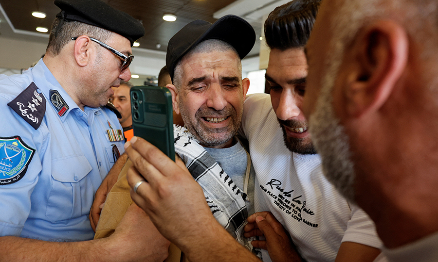 - Οι Παλαιστίνιοι κρατούμενοι που απελευθερώθηκαν από το Ισραήλ στο πλαίσιο της συμφωνίας έφτασαν στη Λωρίδα της Γάζας και στην κατεχόμενη από το Ισραήλ Δυτική Οχθη, με ξυρισμένα κεφάλια και κάποιοι πολύ αδύνατοι.