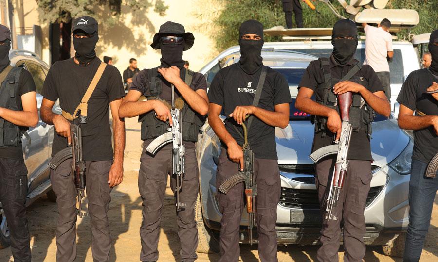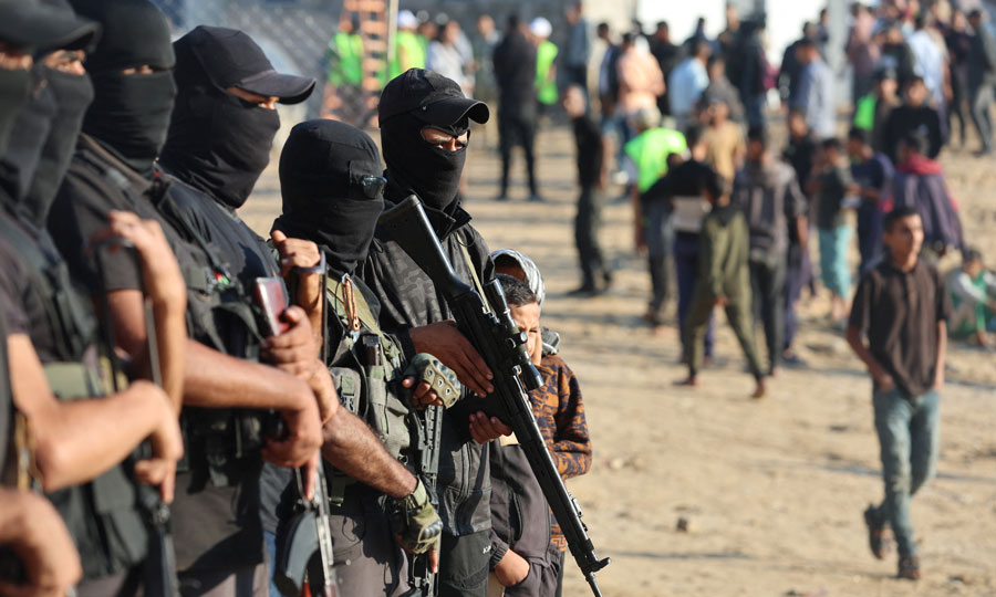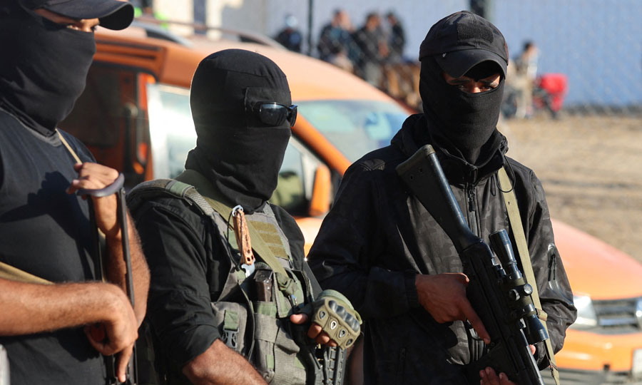 Ενοπλοι Παλαιστίνιοι φρουροί κατά την παράδοση των Ισραηλινών ομήρων στη Διεθνή Επιτροπή του Ερυθρού Σταυρού στο Χαν Γιουνίς, στη νότια Λωρίδα της Γάζας (REUTERS/Ramadan Abed).