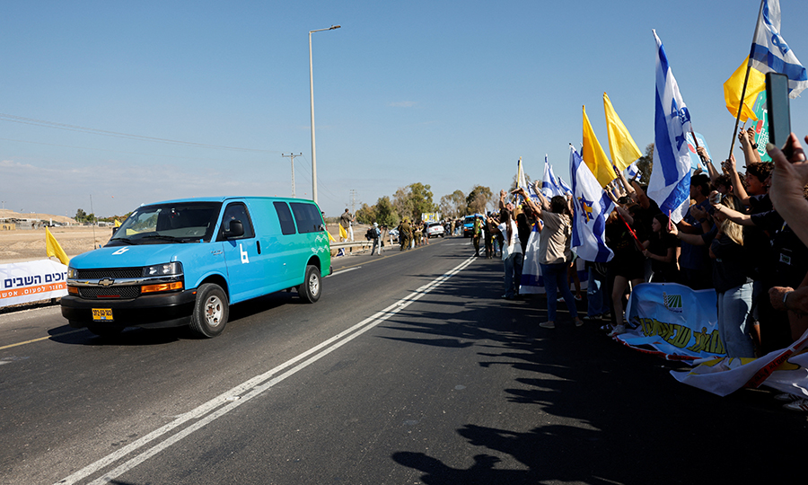 Πομπή που μεταφέρει απελευθερωμένους ομήρους, οι οποίοι κρατούνταν στη Γάζα φτάνει στο Ρέιμ, στο νότιο Ισραήλ (REUTERS/Amir Cohen).