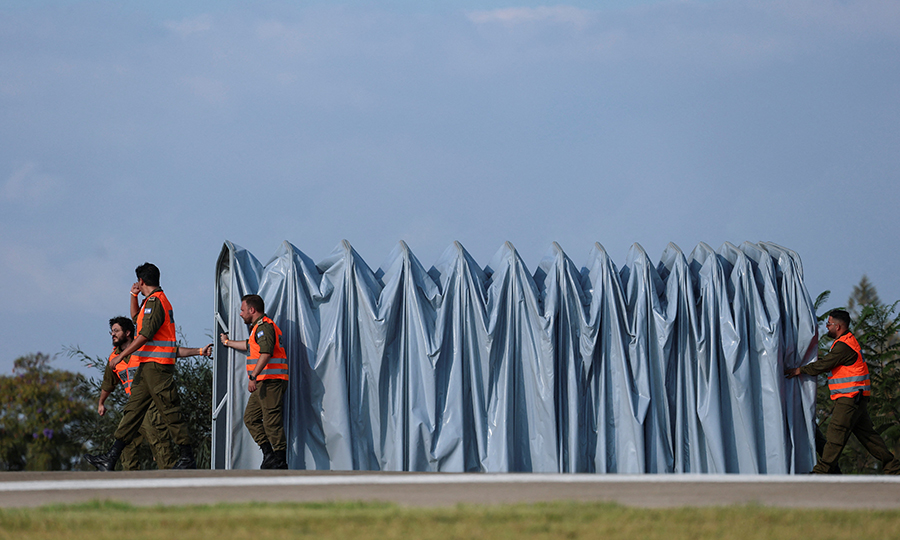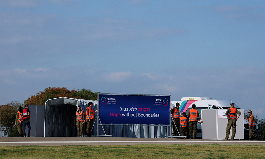 Προετοιμασίες για την άφιξη των Ισραηλινών ομήρων, που κρατούνται στη Γάζα έξω από Ιατρικό Κέντρο στο Ραμάτ Γκαν στο Ισραήλ (REUTERS/Hannah McKay).
